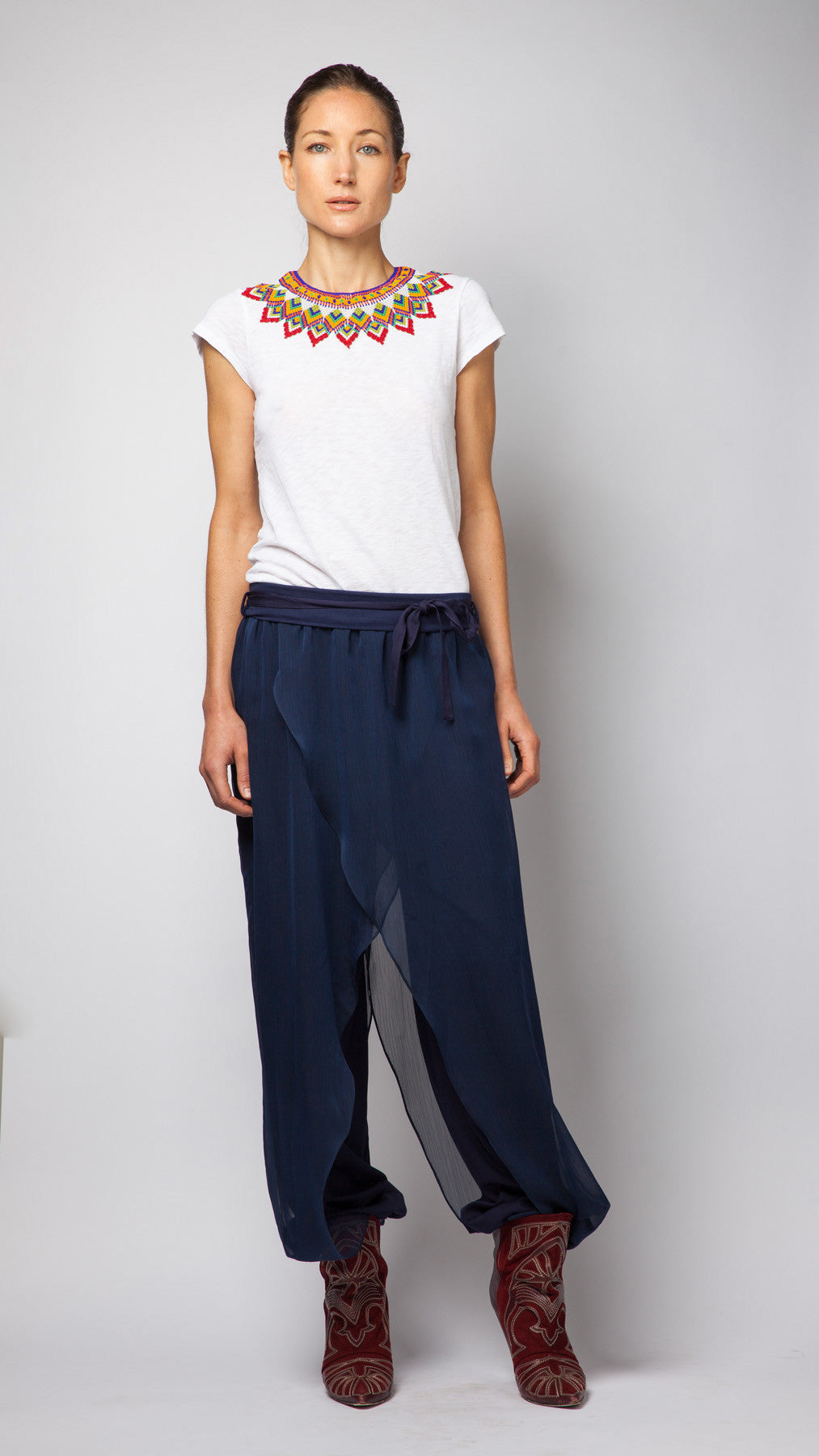 These navy blue feminine ruffle track pants are an elevated take on streetwear styles. Cut from silk that feels beautifully soft, this pair has a soft flexible jersey waistband with silk tie belt. Pants have jersey cuffs that allow you to cinch pants up at the ankle. Wear yours with boots or sneakers for a relaxed look. Dress them up with heels. Shown here with the Tribal Bib-like Beaded Necklace.