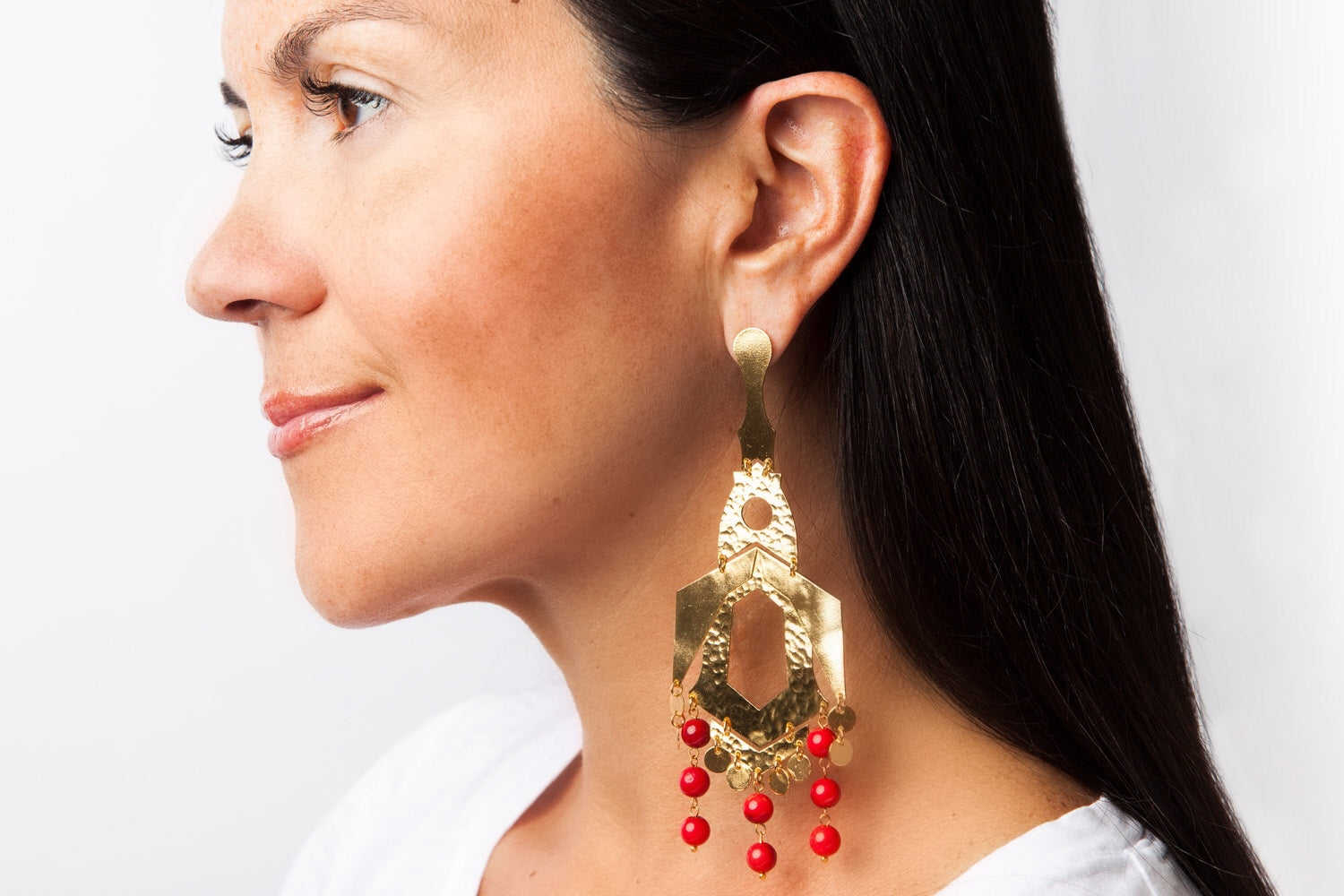 Cascading Wooden Hoop 24k Gold Plated Flower Earrings